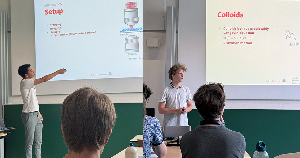 We congratulate Adriaan and Joost, two of our bachelor students who successfully completed their internships in our department and presented their research at the university’s annual Physics Symposium. Over eight weeks, they made valuable contributions to our work in soft matter and optical manipulation, and their final presentations were well received by the academic community.